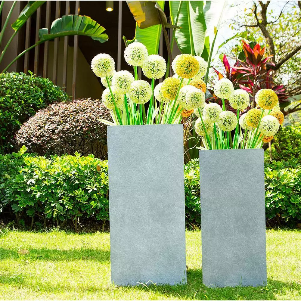 - Elegant set of square planters with visible pores: create a modern space using these tall wide planters, where the straight lines and solid grey finish are a hot trend in modern landscape designs