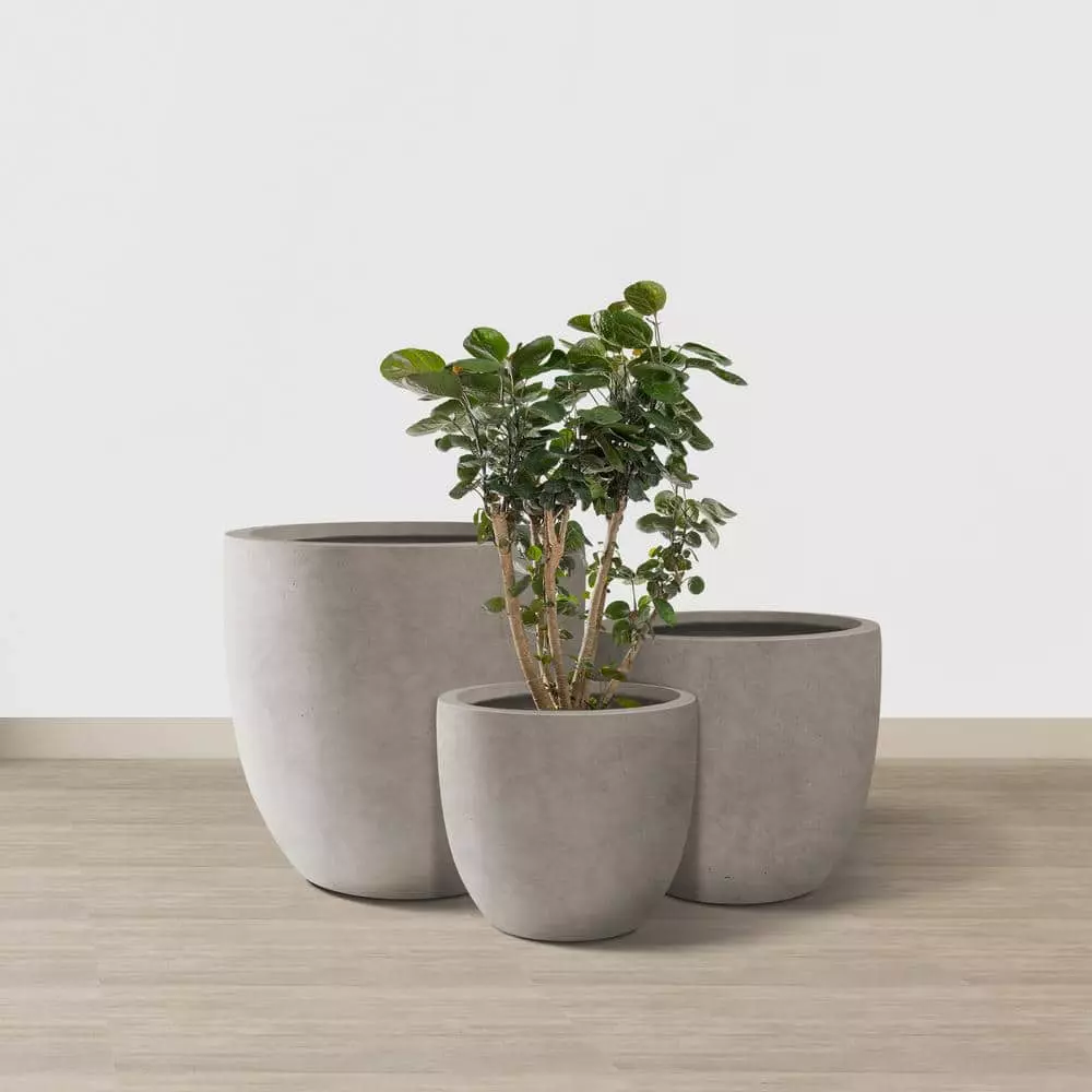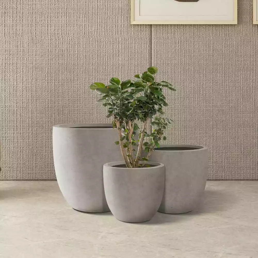 These elegant round planters have authentic concrete finish with visible pores making them beautiful contemporary pieces. The look and feel is true concrete but it weighs substantially less than it looks and makes it easier to move around, it is smooth instead of rough concrete potters you might be used to and will help you maintain a modern design throughout your space. The size is very generous and can hold a good amount of plants without looking crowded. Would look great on apartment balcony or large backyard patio, you can’t go wrong with the grey finish as it blends well with any decor, they can be used individually, as a set or in a row to promote unity. Made of lightweight concrete and weather-resistant fiberglass through an ecofriendly manufacturing process, it has all the advantages of concrete such as strength, durability, weather and damage resistance, strong UV resistant ability and stay well in wind, rain, hot and cold season.