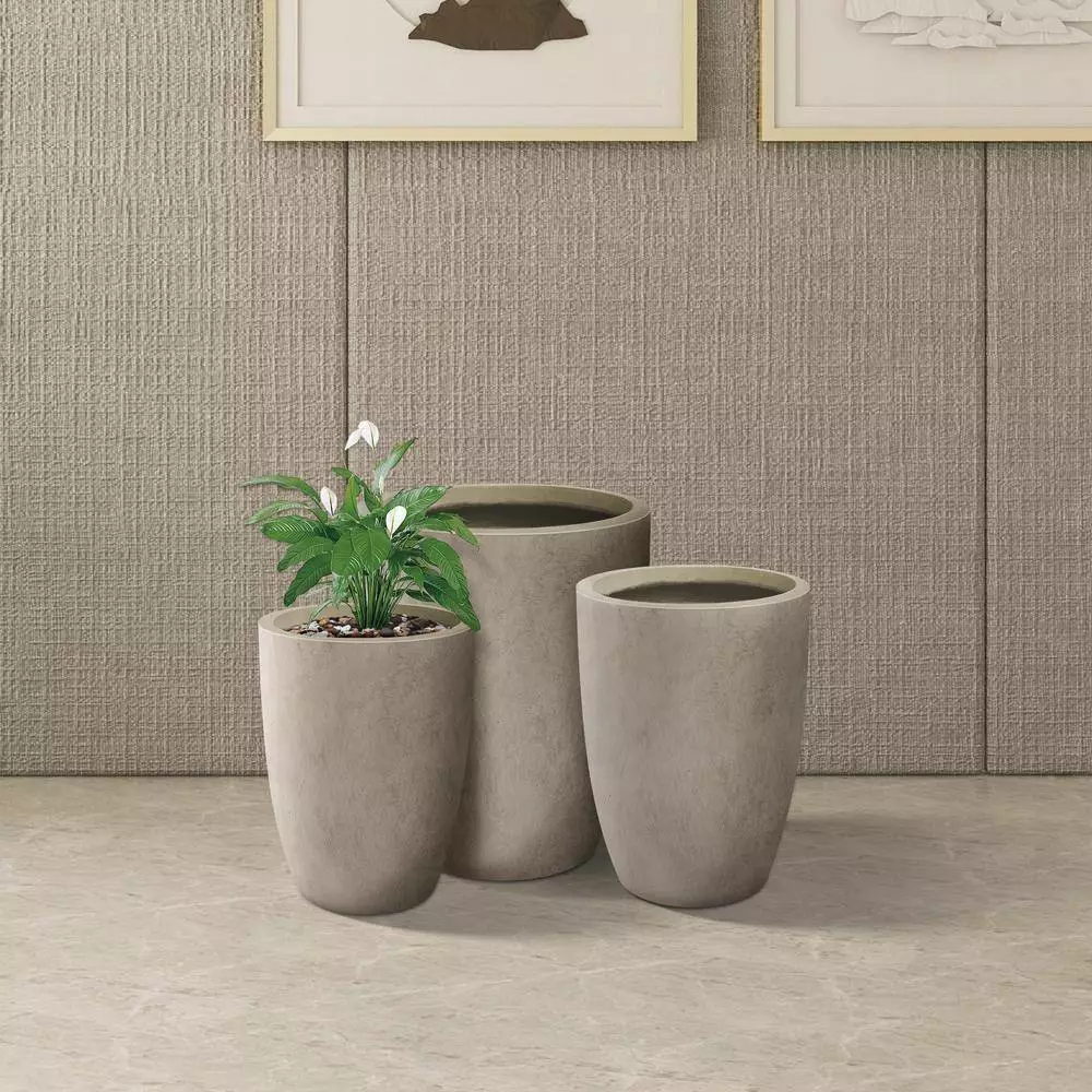These elegant tall planters have authentic concrete finish with visible pores making them beautiful contemporary pieces. The look and feel is true concrete but it weighs substantially less than it looks and makes it easier to move around. It is smooth instead of rough concrete potters you might be used to and will help you maintain a modern design throughout your space. The size is very generous and can hold a good amount of plants without looking crowded. Would look great on apartment balcony or large backyard patio. You can’t go wrong with the grey finish as it blends well with any decor. They can be used individually, as a set or in a row to promote unity. Made of lightweight concrete and weather-resistant fiberglass through an ecofriendly manufacturing process. It has all the advantages of concrete such as strength, durability, weather and damage-resistance, strong UV-resistant ability and stay well in wind, rain, hot and cold season.