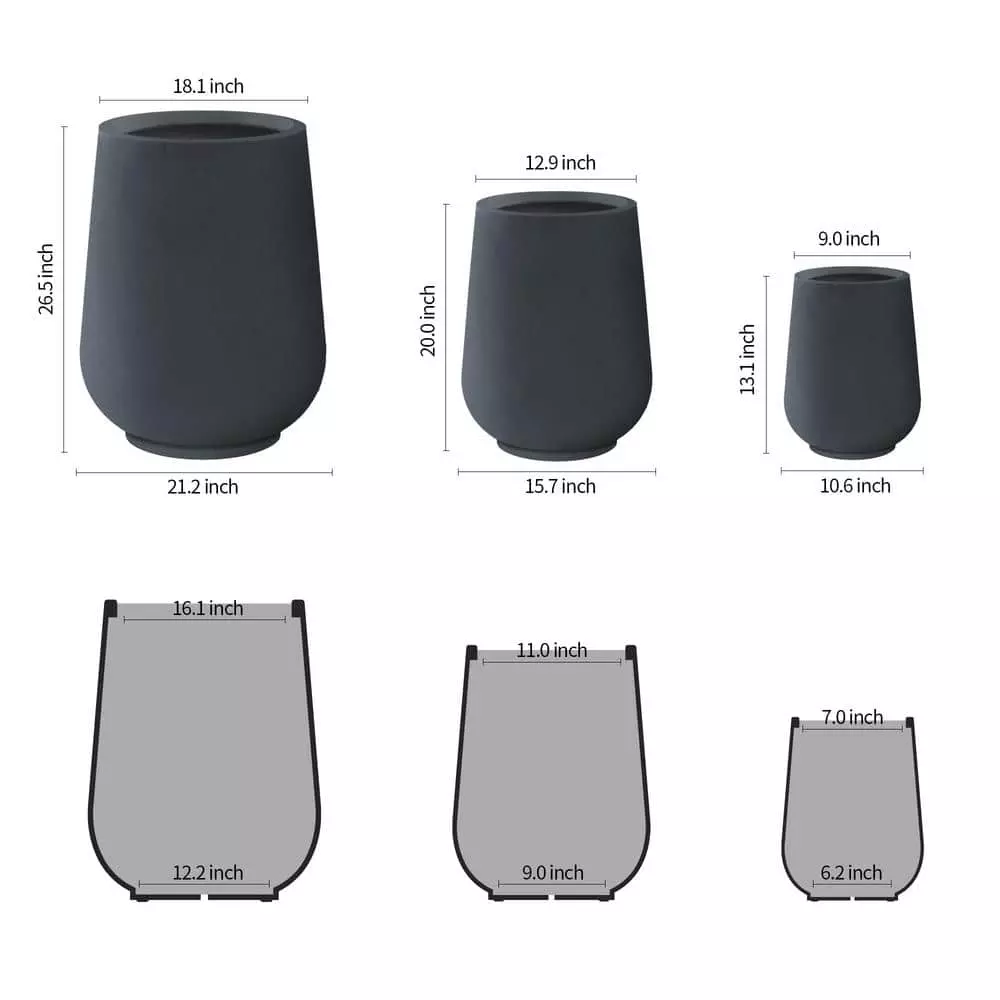 - Large and versatile: large – 21.2 in. W x 21 in. L x 26.5 in. H, medium – 15.7 in. W x 15.7 in. L x 20 in. H, small – 10.6 in. W x 10.6 in. L x 13.1 in. H, all with drainage holes and rubber plugs will fit perfectly in any indoor or outdoor setting