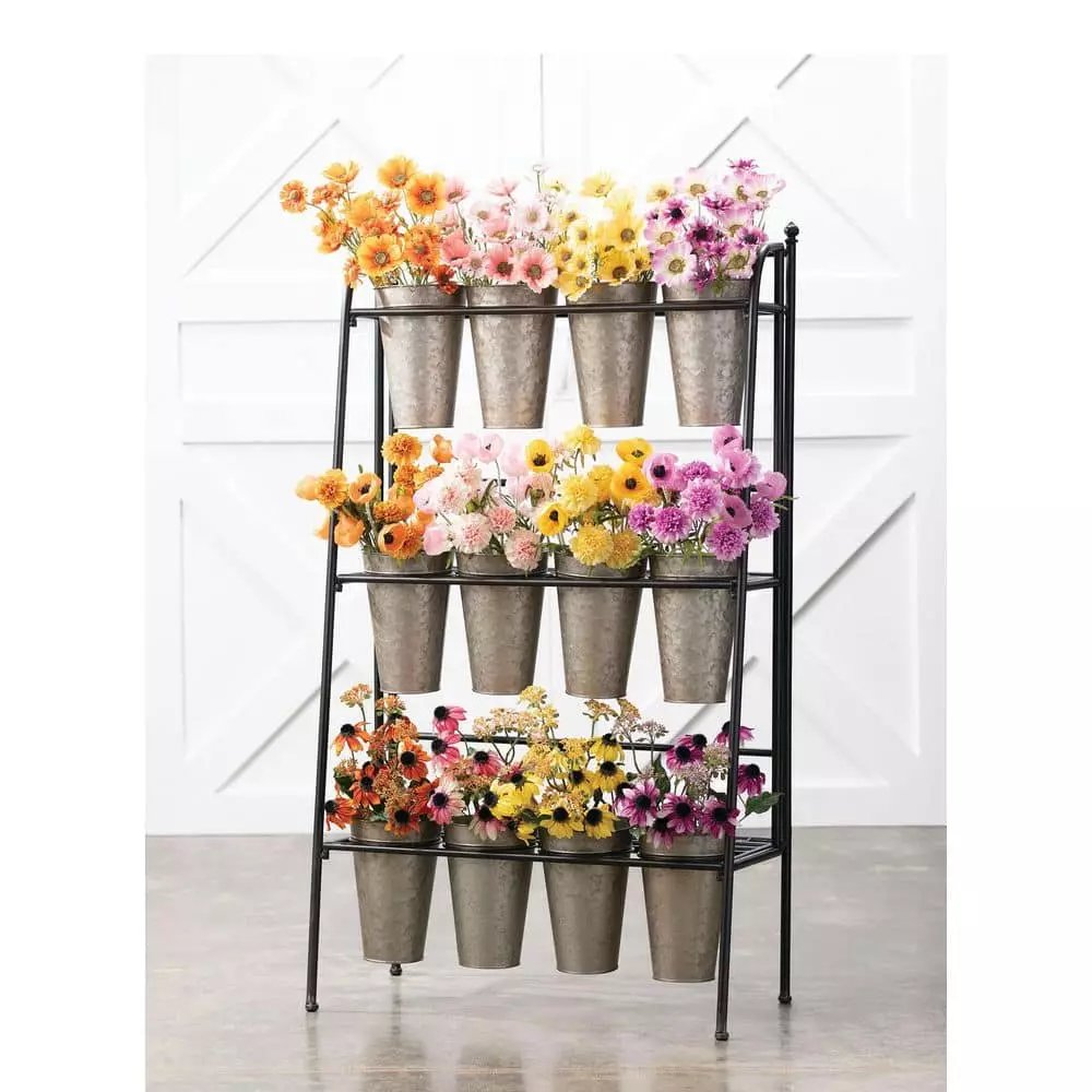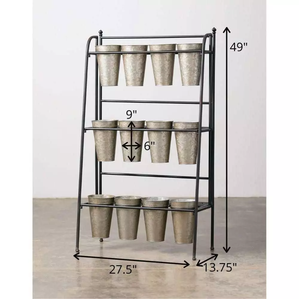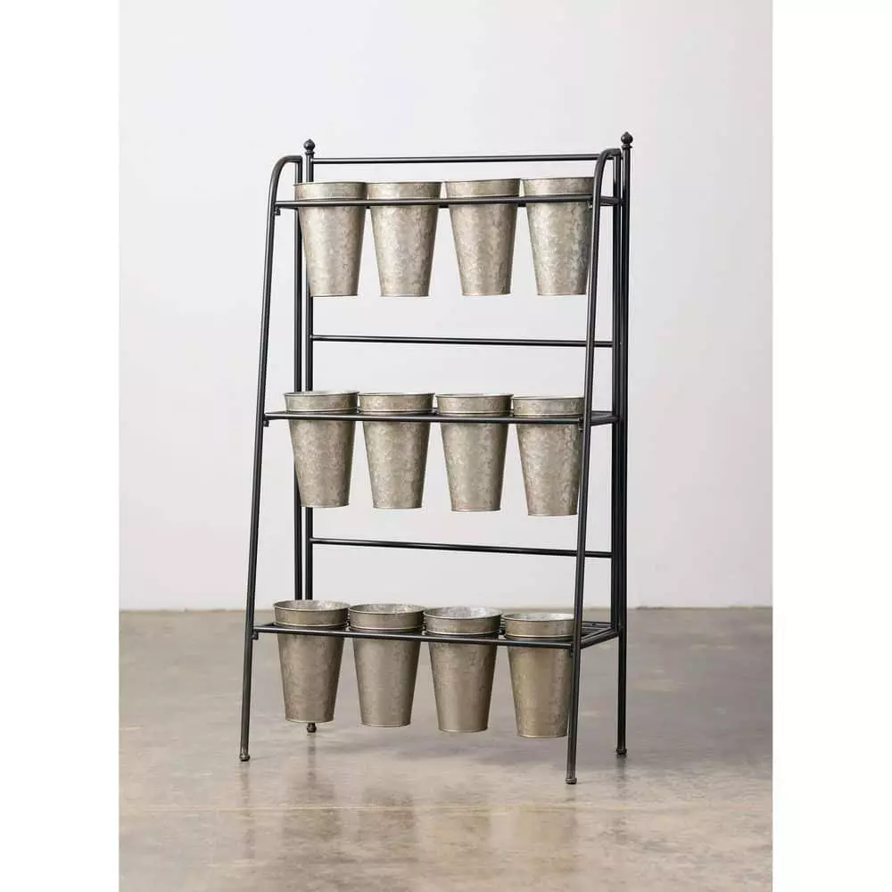- Piece features 3 elevated rows and comes with 12 metal vases
