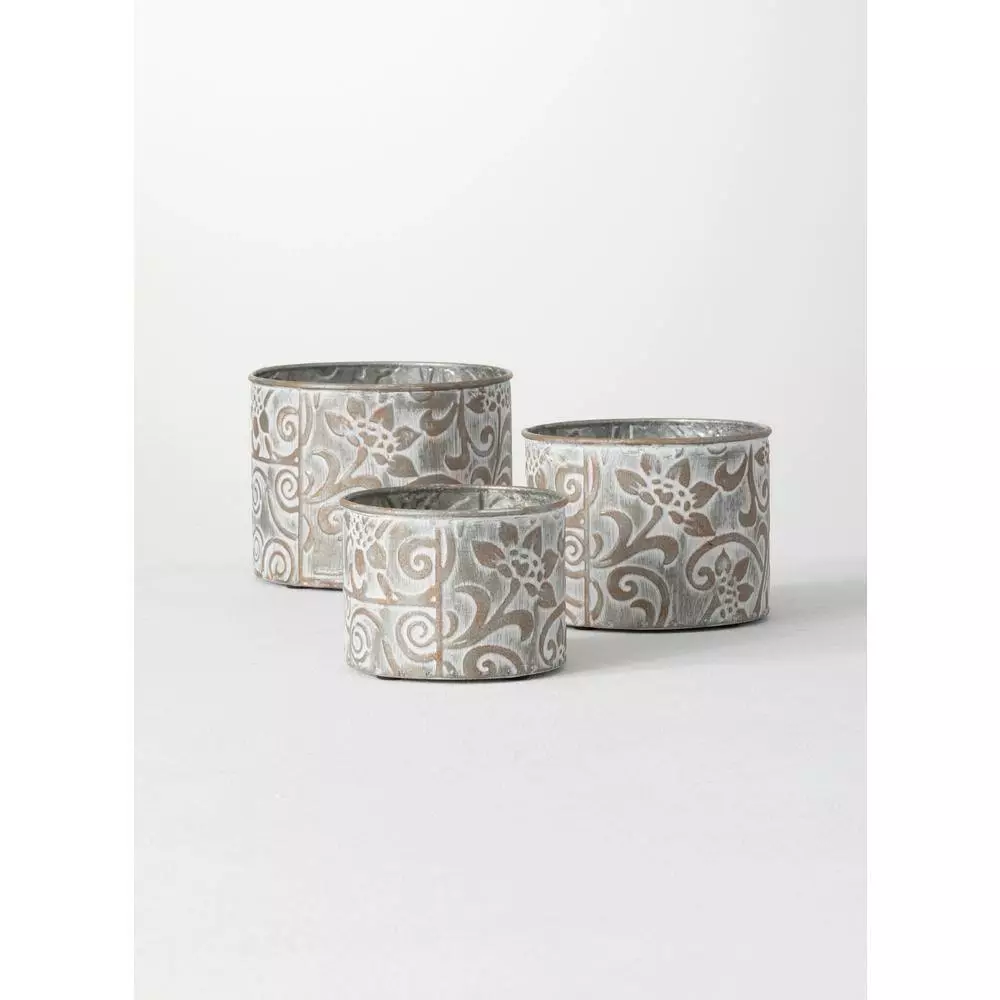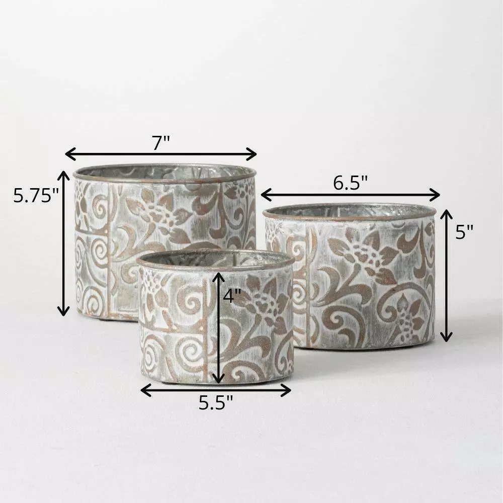 1 can never have too many planters and these whitewashed embossed iron beauties are truly proof. Rustic shades of gray and brown are enhanced with a matte finish and etched with mosaic scroll and leaf patterns. Gorgeous filled with any floral or green-you are only left with your imagination on how to bring this duo to life. Over the last 52-years, Sullivans has become an industry leader in home decorations. Our brand is rooted in tradition while incorporating modernized trends to keep your home looking up to date with timeless style. Here at Sullivans, we pride ourselves on creating product designs focused on quality and value, ensuring that our customers have access to beautiful products at reasonable price points.