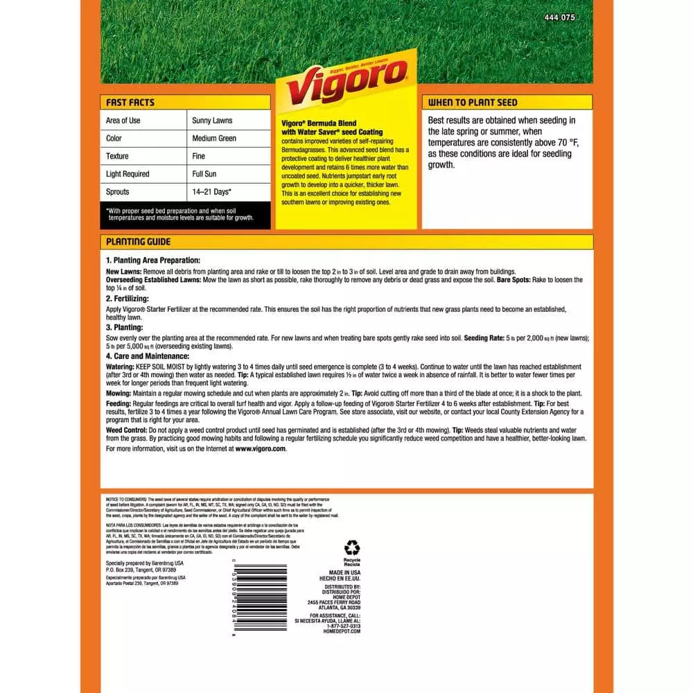 Vigoro Bermuda Blend with Water Saver Seed Coating contains improved varieties of self-repairing bermuda grasses. The coated seeds retain 6X more water than uncoated seeds, gradually releasing water back to the plant during the establishment phase of your lawn. The seed coating also adds nutrients and fungicide to promote quick root growth and protect the seedlings from disease. This VIGORO blend thrives in warm sunny areas and is guaranteed to grow.