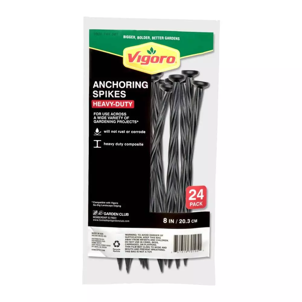 Vigoro Anchoring Spike Packs should be used to secure Vigoro No-Dig Edging. Vigoro anchoring spikes are useful when making tight curves or circular designs with Vigoro No-Dig Edging. They can also be used as a general anchoring spike for many other landscape applications. Vigoro No-Dig Edging products. The nylon spiral spikes are made from heavy-duty plastic composite and are very durable for both residential and commercial anchoring applications. Includes 24 nylon spiral spikes, each 8 in. L.